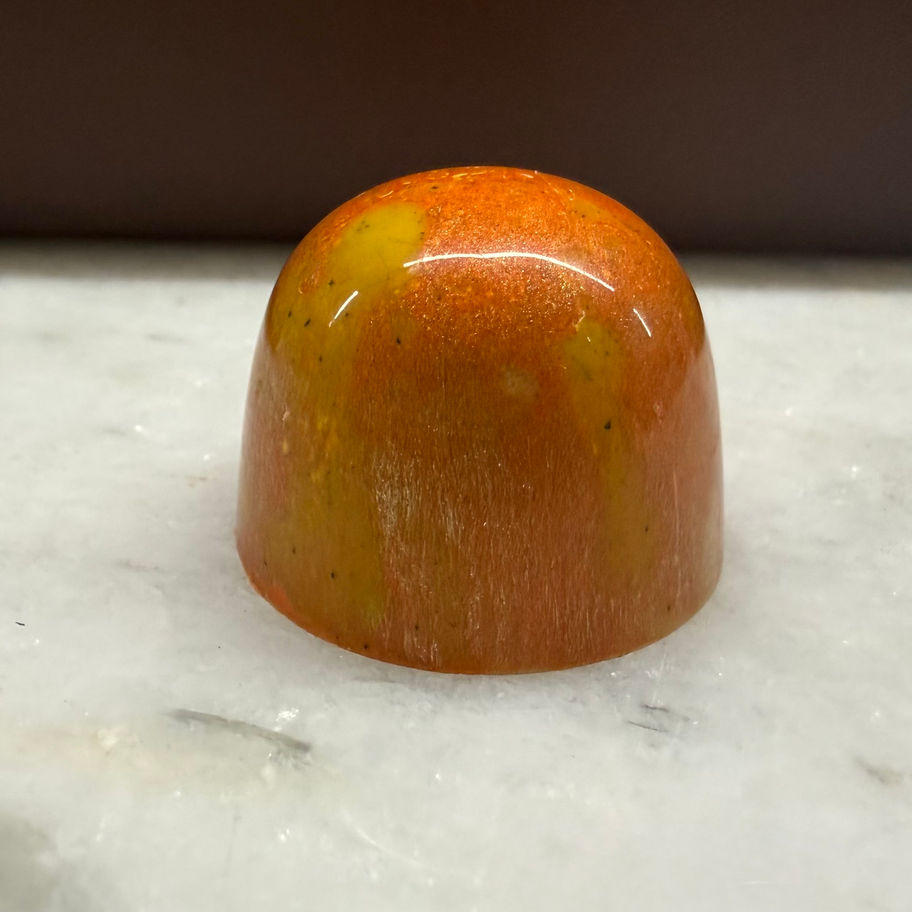 Colter's Run Whiskey and Orange Bon Bon; Whisked infused Ganache with a bright orange fruit layer encased in a Dark Chocolate shell